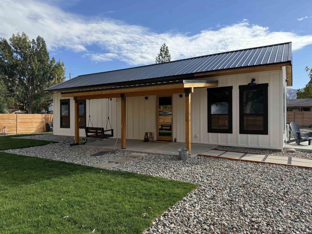 Located in the heart of Horseshoe Bend, this cozy modern farmhouse sits on a spacious lot featuring thoughtful custom upgrades throughout. This 2-bed, 1-bath, 948 sq ft home includes three covered porches, each with its own entry. Inside, you'll find sealed concrete floors, vaulted ceilings, & an open concept layout w/8-ft doors. Large bathroom offers a walk-in shower, & room for a washer/dryer combo. Experience comfortable year-round climate via three ductless mini-split systems. Kitchen is complete w/Samsung & GE appliances, convenient bar seating, while triple black single hung Anderson windows bring in natural light. Finger-jointed painted wood trim adds a clean, finished touch throughout the interior. Outside, the home features concrete board siding w/finger-jointed wood battens & trim, metal roof, & fir tongue-and-groove soffits. Privacy fence surrounds the lot creating a peaceful, private retreat. Exterior spigot w/hot & cold for added convenience. A new shed is being constructed & will be included for extra storage. New sod recently laid in the front yard.
