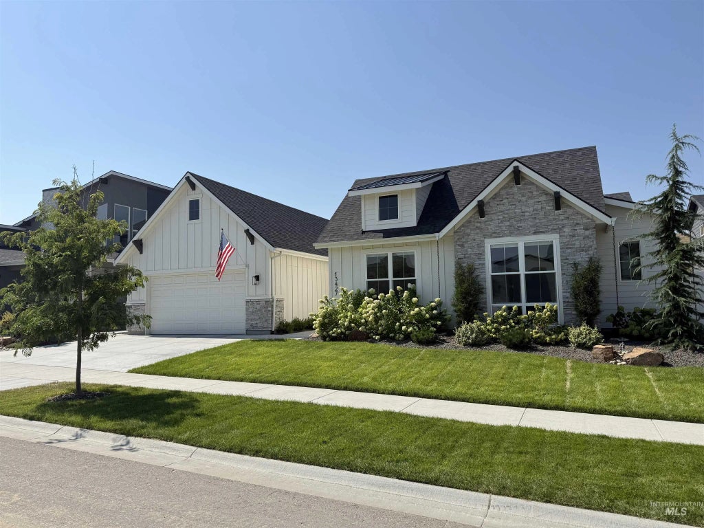 Incredible new opportunity in Dry Creek Ranch - this better-than-new single-level farmhouse has been freshly priced to sell. Situated on a 1/3 acre lot, the home offers 4 bedrooms including 2 suites and a Jack & Jill, 3.5 baths, an office, and a split-bedroom design ideal for guests or multi-gen living. The oversized 4-car tandem garage with epoxy floors provides rare storage and parking flexibility. Interior upgrades include hardwood floors, quartz counters, custom lighting, motorized blinds, and whole-home water treatment with humidifier, softener, and filtration system. The backyard features an extended patio and tiered hillside - perfect for gardening, entertaining or relaxation. Enjoy the unmatched resort lifestyle of Dry Creek Ranch with clubhouse, gym, coffee shop, community farm, two pools, parks, trails, and top-rated Eagle schools.