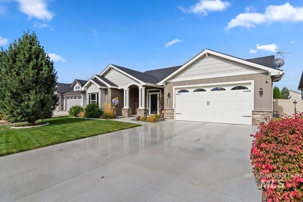 This charming single-level home welcomes you with a beautifully landscaped yard and a covered front porch, perfect for enjoying your morning coffee. Inside, you’ll love the custom details throughout, including craftsman-style trim, coffered ceilings, modern light fixtures, and engineered hardwood floors that flow seamlessly into the light-filled great room, featuring a gas fireplace with a raised-hearth brick surround. The chef’s kitchen impresses with an expansive center island, custom multi-tier cabinetry, granite countertops, full tile backsplash, high-end appliances, gas range, farmhouse sink, and two pantries, and it connects effortlessly to the dining room, ideal for entertaining. The split-bedroom floorplan provides privacy for the spacious primary suite, which includes a walk-in closet with built-ins, a floor-to-ceiling tiled step-in shower, a separate soaking tub, dual sinks, and abundant storage. The backyard offers the perfect place to unwind, with an extended covered patio, garden area with concrete curbing, 8’x10’ insulated storage shed, and a lush grassy yard. This house is brimming with upgrades, including a Culligan whole-house water softener, water filtration system, and a Coltrin central vac system. With a large laundry room featuring cabinetry and a sink, plus a mudroom off the three-car garage, this home truly has it all!